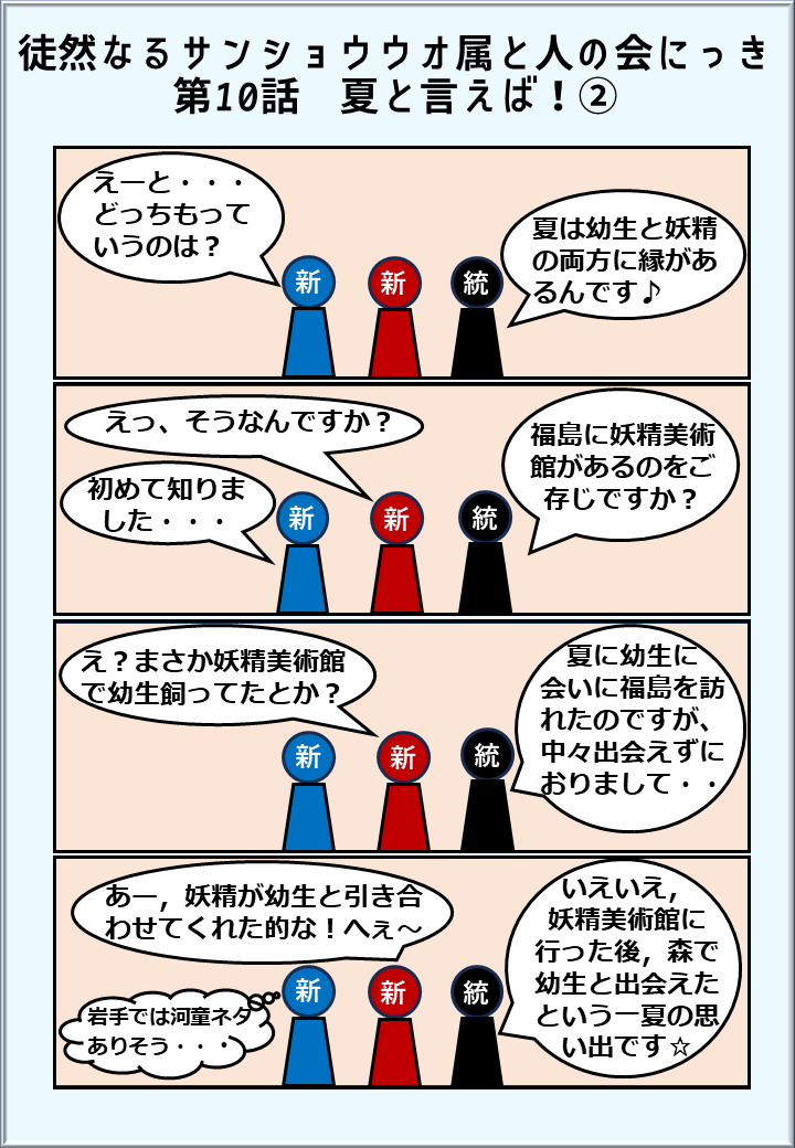 文化芸術部門でございます。当会の日常を描く4コマ漫画「徒然なるサンショウウオ属と人の会にっき」の連載をしております。会の中で繰り広げられたエピソードを少し愉快めにし、不定期で更新して参ります。リンクは以下になりますので(1~5話がPDF形式,6話以降がPNG形式となっております),当会の人員にご興味のある方は,ご覧いただけますと幸いです。