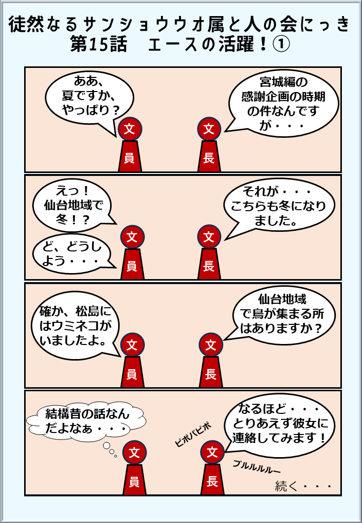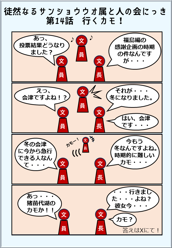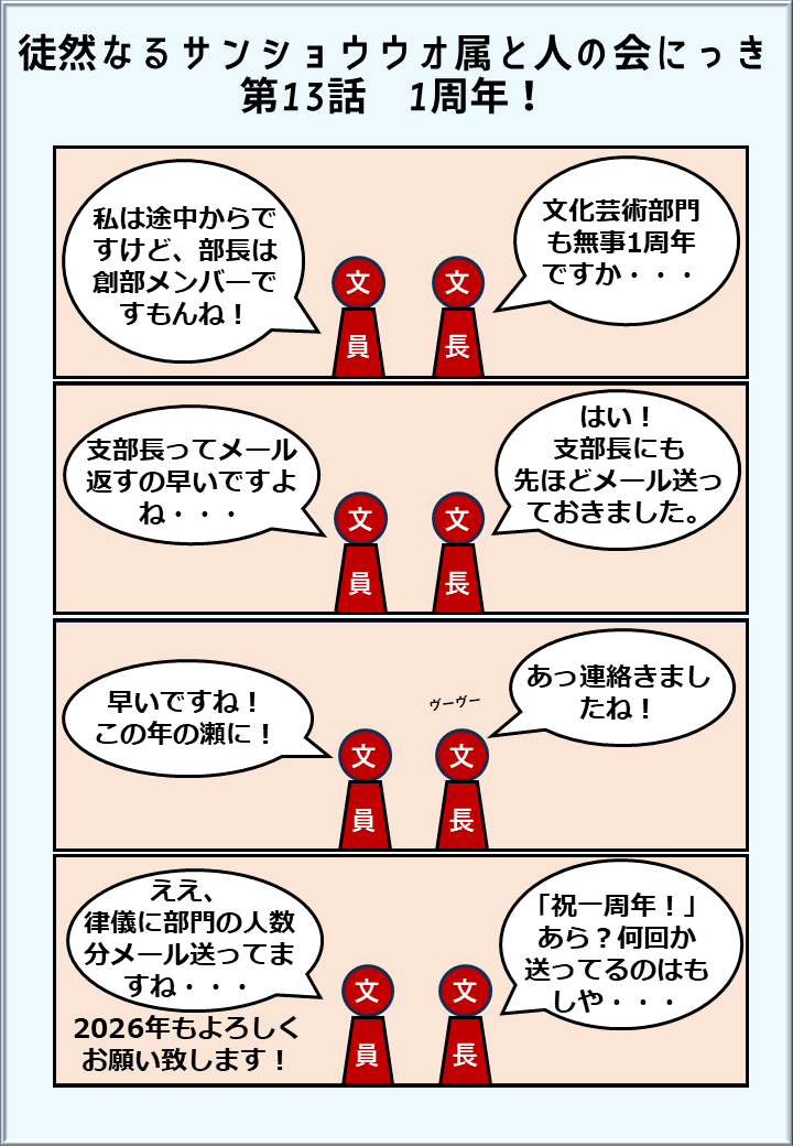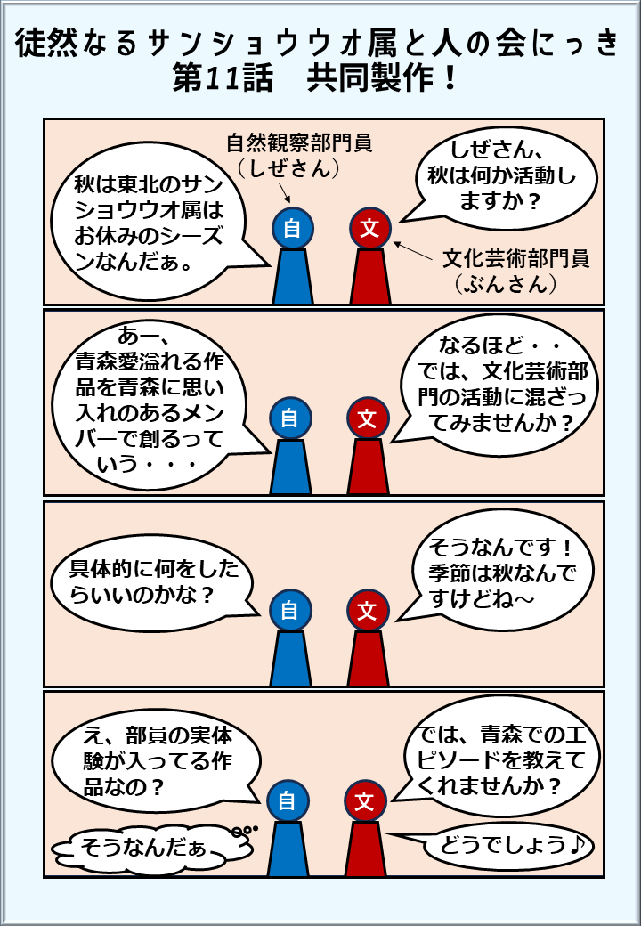 文化芸術部門でございます。当会の日常を描く4コマ漫画「徒然なるサンショウウオ属と人の会にっき」の連載をしております。会の中で繰り広げられたエピソードを少し愉快めにし、不定期で更新して参ります。リンクは以下になりますので(1~5話がPDF形式,6話以降がPNG形式となっております),当会の人員にご興味のある方は,どうぞご覧くださいませ☆彡