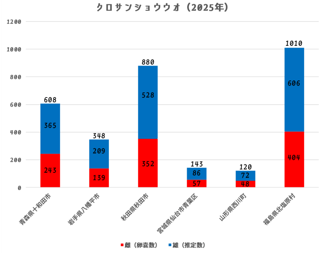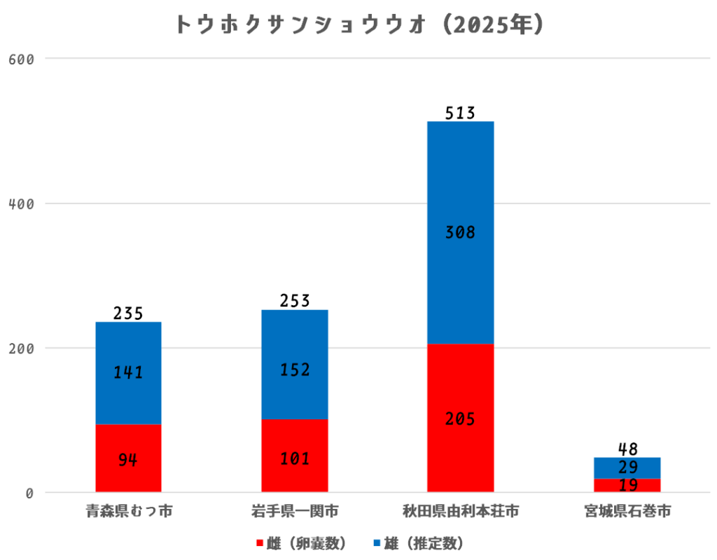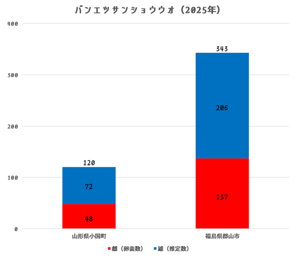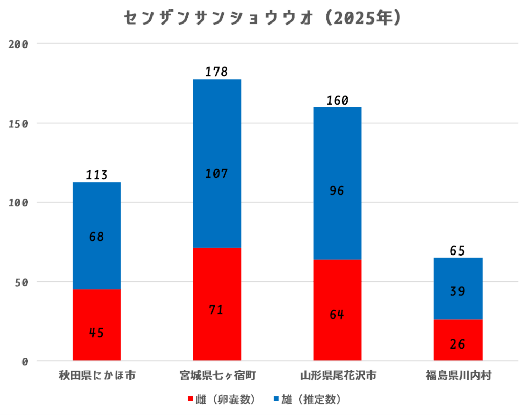 なお、秋田県のみ、本県に分布する3種(トウホクサンショウウオ・センザンサンショウウオ・クロサンショウウオ)の全市町村の卵嚢数および推定個体数データを取得しておりますが、こちらは来年以降の調査結果等と合わせ、別途報告予定です。